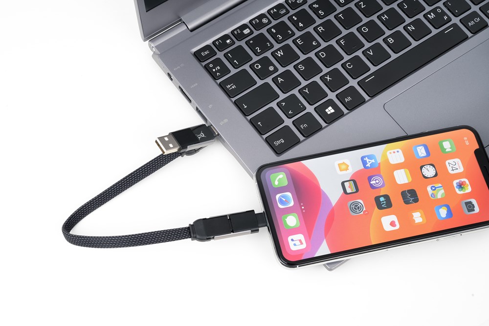 Schnellladekabel mit Flaschenöffner für unterwegs, USB/USB-C auf Lightning oder USB-C, mit Datenübertragungsfunktion, Kabel textilummantelt, Metall, matt, schwarz